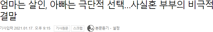 이슈 8살 딸 살해후 방치한 엄마, 아빠는 소식 듣고 극단 선택 페이지 정보 댓글 0건 작성일 21-01-19 10:17 본문 8살 딸 살해후 방치한 엄마, 아빠는 소식 듣고 극단 선택 https://news.naver.com/main/read.nhn?mode=LSD&mid=sec&sid1=001&oid=025&aid=0003070354 요약 엄마가 출생신고를 하지 않은 8살 짜리 딸을 살해 한 후 자신도 자살 하려다가 구속 아버지는 딸의 사망 소식을 듣고 스스로 목숨을 끊음 딸은 이미 일주일 전에 살해 하고 자신은 자살하려 했음 아버지는 경찰서에서 조사받고 딸 사망 소식 듣고 집에서 자살 추천0 페이스북 공유 트위터 공유 구글+ 공유 검색 목록 댓글목록 댓글목록 등록된 댓글이 없습니다.