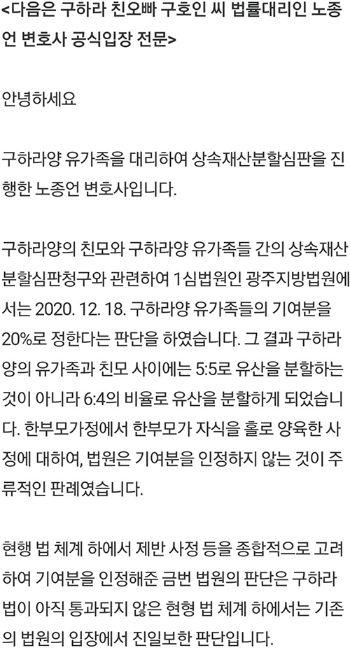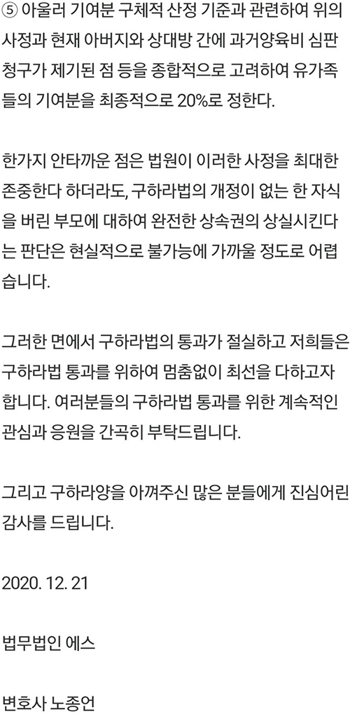 故구하라 친오빠 친모 상속재산 소송 일부인용 6대4 분할 결정 페이지 정보 댓글 0건 작성일 20-12-22 14:21 본문 법 개정없이는 자식 버린 부모여도 완전한 상속권의 상실은 불가능 구하라 친모가 재산 40% 가져감 추천0 페이스북 공유 트위터 공유 구글+ 공유 목록 댓글목록 댓글목록 등록된 댓글이 없습니다.