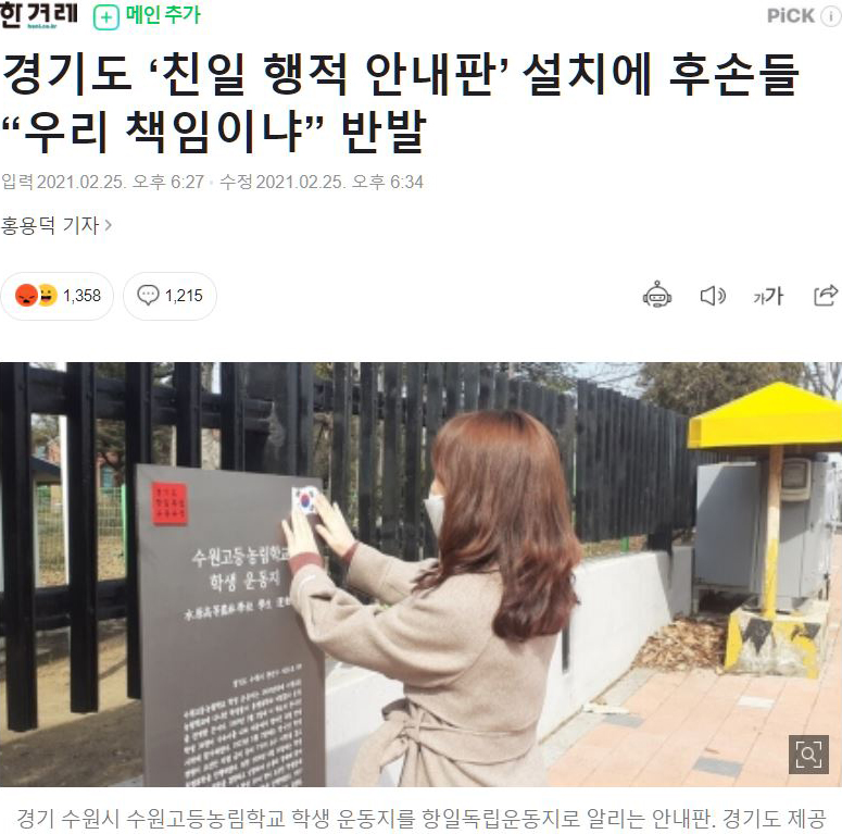 이슈 친일파 후손들 '친일 행적 기념물 반대' 페이지 정보 댓글 0건 작성일 21-03-02 11:35 본문 친일파 후손들 '친일 행적 기념물 반대' https://news.naver.com/main/read.nhn?mode=LSD&mid=sec&sid1=102&oid=028&aid=0002534172 친일 후손들은 현재 ‘그분들 때문에 왜 후손이 고통을 받냐’ ‘후손들이 무슨 책임이 있느냐’ 언제까지 따질거냐는 논리로 기념물 설치 결사반대한다는 의견을 밝힘 추천0 페이스북 공유 트위터 공유 구글+ 공유 검색 목록 댓글목록 댓글목록 등록된 댓글이 없습니다.
