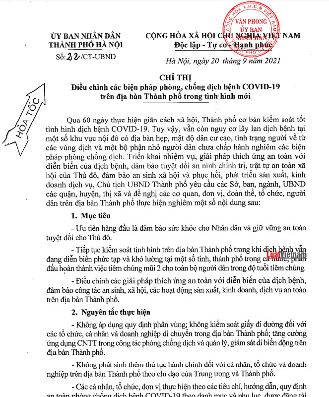 하노이시 인민위원회는 어제(9/20일) 저녁 새로운 상황에서의 전염병을 예방하고 통제하기 위한 여러 조치가 포함된 지시령 22/CT-UBND호를 발표했다. 구체적인 공문 내용은 다음과 같다.