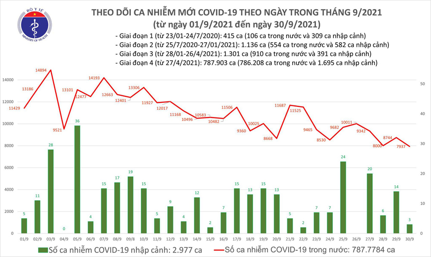 베트남 보건부는 오늘(9/30일) 저녁 코로나19 확진자 총 7,940건 (국내 7,937건, 해외 3건)을 추가 발표해 누적 확진자는 총 790,755건으로 증가했다. 이에 따라, 지난 24시간 동안 국내 확진자는 전날 대비 807건 감소한 것으로 나타났다.
