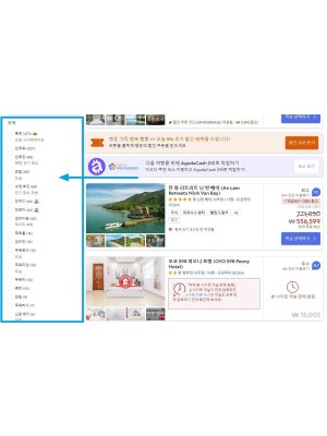 아고다에서는 지역 필터를 통해 해당 지역의 위치한 호텔만 확인할 수 있습니다.